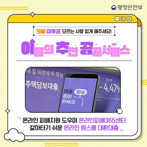 – 5월 추천 공공서비스, ‘온라인피해365센터’와 ‘온라인 원스톱 대환대출’ 선정