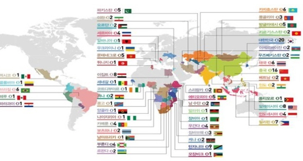 * (총 175명) 가나(2), 나이지리아(1), 남수단(2) 남아공(1), 대한민국(20), 동티모르(1), 르완다(2), 말라위(1), 말레이시아(8), 멕시코(1), 모잠비크(1), 몬테네그로(5), 몽골리아(3), 방글라데시(5), 베트남(2), 보츠와나(2), 부룬디(4), 브라질(6), 세네갈(1), 세르비아(4), 스리랑카(2), 아제르바이젠(2), 알바니아(1), 앙골라(1), 에티오피아(5), 요르단(2), 우간다(4), 우즈베키스탄(2), 우크라이나(1), 이란(2), 이집트(8), 인도(2), 인도네시아(4), 잠비아(1), 중국(16), 짐바브웨(3), 카메룬(4), 카자흐스탄(6), 케냐(2), 코트디부아르(1), 콜롬비아(1), 콩고(1), 키르기스스탄(2), 탄자니아(9), 태국(6), 튀니지(1), 파라과이(1), 파키스탄(5), 페루(1), 필리핀(7)